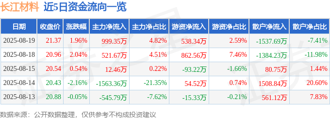 证券之星消息,截至2025年8月19日收盘,长江材料(001296)报收于21.37元,上涨1.96%,换手率12.67%,成交量9.74万手,成交额2.08亿元。