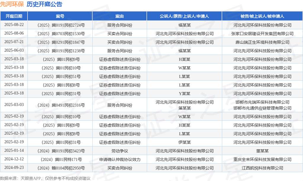 案号:(2025)冀0191民初2724号根据统计,近一年内以河北先河环保科技股份有限公司为当事人的历史开庭公告有17则,其中案由为“证券虚假陈述责任纠纷”的公告以9则居首,其次为“买卖合同纠纷”有3则,“服务合同纠纷”有3则。历史开庭公告如下: