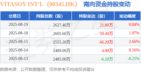 证券之星消息,8月19日南向资金增持21.8万股VITASOY INT'L(00345.HK)。近5个交易日中,获南向资金增持的有4天,累计净增持136.2万股。近20个交易日中,获南向资金增持的有12天,累计净增持185.4万股。截至目前,南向资金持有VITASOY INT'L(00345.HK)2627.4万股,占公司已发行普通股的2.47%。