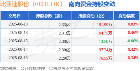 证券之星消息,8月19日南向资金增持191.99万股比亚迪股份(01211.HK)。近5个交易日中,获南向资金增持的有4天,累计净增持457.03万股。近20个交易日中,获南向资金增持的有18天,累计净增持1.41亿股。截至目前,南向资金持有比亚迪股份(01211.HK)2.33亿股,占公司已发行普通股的6.31%。