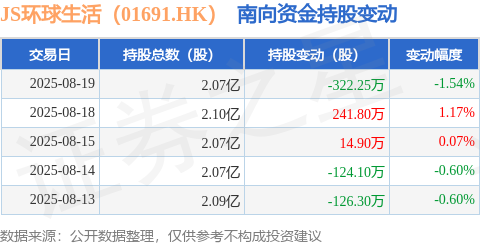 证券之星消息,8月19日南向资金减持322.25万股JS环球生活(01691.HK)。近5个交易日中,获南向资金减持的有3天,累计净减持315.95万股。近20个交易日中,获南向资金减持的有10天,累计净减持978.75万股。截至目前,南向资金持有JS环球生活(01691.HK)2.07亿股,占公司已发行普通股的5.94%。