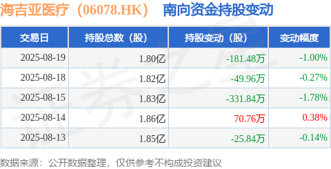 证券之星消息,8月19日南向资金减持181.48万股海吉亚医疗(06078.HK)。近5个交易日中,获南向资金减持的有4天,累计净减持518.36万股。近20个交易日中,获南向资金减持的有11天,累计净减持191.61万股。截至目前,南向资金持有海吉亚医疗(06078.HK)1.8亿股,占公司已发行普通股的29.16%。