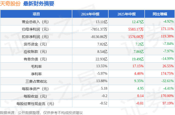 据证券之星公开数据整理,近期天奇股份(002009)发布2025年中报。截至本报告期末,公司营业总收入12.47亿元,同比下降4.92%,归母净利润5583.17万元,同比上升171.11%。按单季度数据看,第二季度营业总收入6.24亿元,同比下降5.62%,第二季度归母净利润1353.02万元,同比上升116.73%。本报告期天奇股份盈利能力上升,毛利率同比增幅26.55%,净利率同比增幅174.75%。