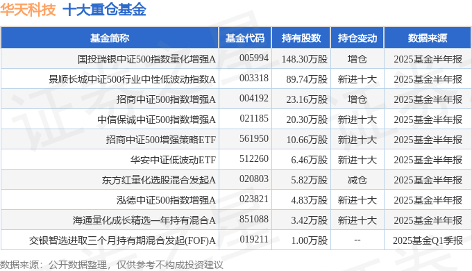 持有华天科技最多的基金为国投瑞银中证500指数量化增强A,目前规模为11.71亿元,最新净值2.4385(8月19日),较上一交易日下跌0.05%,近一年上涨43.84%。该基金现任基金经理为殷瑞飞。
