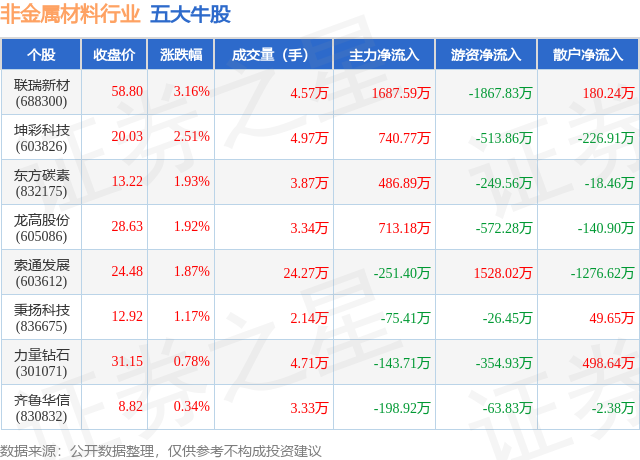 个股表现方面,非金属材料行业当日领涨股为联瑞新材(688300),该股当日报收58.8,上涨3.16%,成交量4.57万,主力资金净流入1687.59万元。坤彩科技(603826)以上涨2.51%紧随其后,该股当日成交量4.97万,主力资金净流入740.77万元。除此之外,东方碳素(832175)、龙高股份(605086)、索通发展(603612)均进入当日牛股之列。具体个股列表见下表: