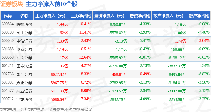 从资金流向上来看,当日证券板块主力资金净流出24.23亿元,游资资金净流出1491.41万元,散户资金净流入24.38亿元。证券板块个股资金流向见下表: