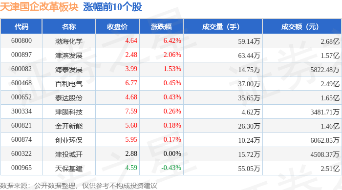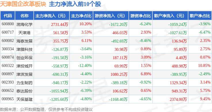 从资金流向上来看,当日天津国企改革板块主力资金净流出2.16亿元,游资资金净流入907.92万元,散户资金净流入2.07亿元。天津国企改革板块个股资金流向见下表:
