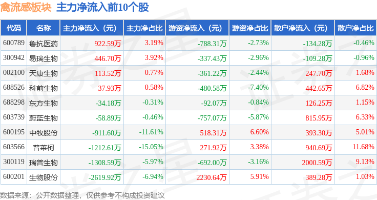 从资金流向上来看,当日禽流感板块主力资金净流出7510.25万元,游资资金净流出455.2万元,散户资金净流入7965.45万元。禽流感板块个股资金流向见下表: