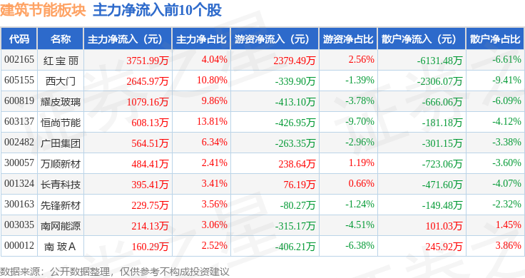 从资金流向上来看,当日建筑节能板块主力资金净流出2.46亿元,游资资金净流入5734.49万元,散户资金净流入1.89亿元。建筑节能板块个股资金流向见下表: