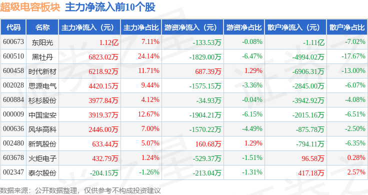从资金流向上来看,当日超级电容板块主力资金净流出8.01亿元,游资资金净流出2260.26万元,散户资金净流入8.23亿元。超级电容板块个股资金流向见下表: