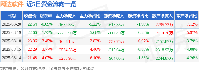 8月20日的资金流向数据方面,主力资金净流出1682.38万元,占总成交额5.22%,游资资金净流出613.35万元,占总成交额1.9%,散户资金净流入2295.73万元,占总成交额7.12%。