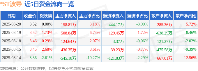 8月20日的资金流向数据方面,主力资金净流入158.81万元,占总成交额3.18%,游资资金净流出444.17万元,占总成交额8.9%,散户资金净流入285.36万元,占总成交额5.72%。