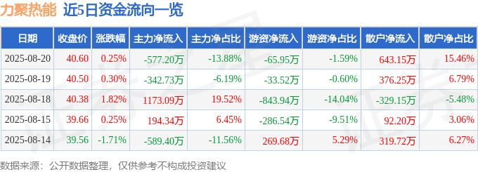 证券之星消息,截至2025年8月20日收盘,力聚热能(603391)报收于40.6元,上涨0.25%,换手率4.51%,成交量1.03万手,成交额4159.05万元。