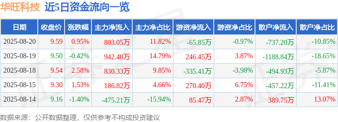 证券之星消息,截至2025年8月20日收盘,华旺科技(605377)报收于9.59元,上涨0.95%,换手率1.28%,成交量7.15万手,成交额6794.85万元。
