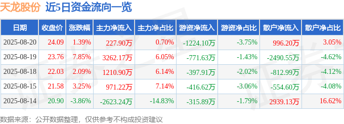 证券之星消息,截至2025年8月20日收盘,天龙股份(603266)报收于24.09元,上涨1.39%,换手率7.01%,成交量13.94万手,成交额3.27亿元。