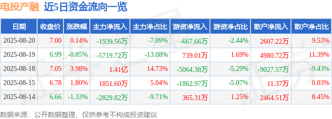 证券之星消息,截至2025年8月20日收盘,电投产融(000958)报收于7.0元,上涨0.14%,换手率0.73%,成交量39.31万手,成交额2.74亿元。