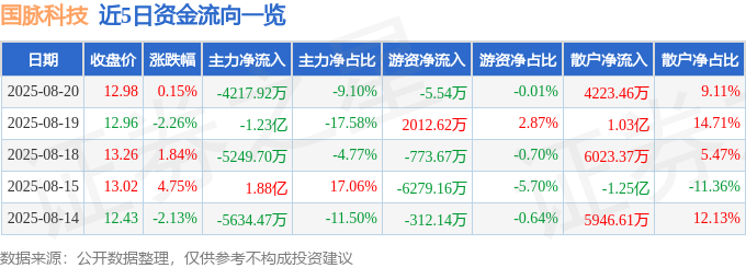 证券之星消息,截至2025年8月20日收盘,国脉科技(002093)报收于12.98元,上涨0.15%,换手率3.58%,成交量36.04万手,成交额4.63亿元。