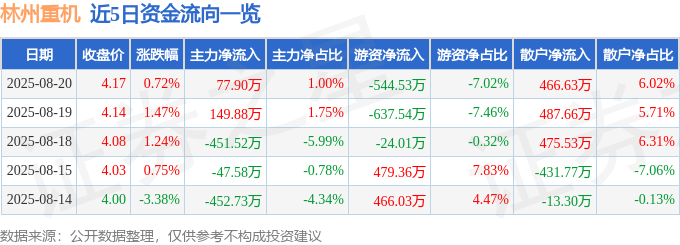 证券之星消息,截至2025年8月20日收盘,林州重机(002535)报收于4.17元,上涨0.72%,换手率2.5%,成交量18.68万手,成交额7753.16万元。