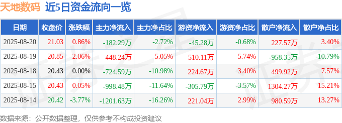 证券之星消息,截至2025年8月20日收盘,天地数码(300743)报收于21.03元,上涨0.86%,换手率2.54%,成交量3.23万手,成交额6696.28万元。