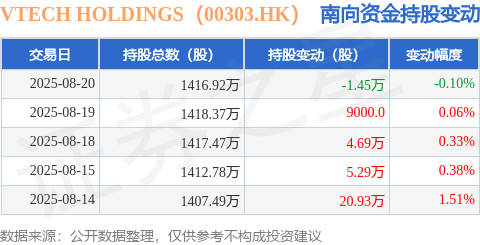 证券之星消息,8月20日南向资金减持1.45万股VTECH HOLDINGS(00303.HK)。近5个交易日中,获南向资金增持的有4天,累计净增持30.36万股。近20个交易日中,获南向资金增持的有19天,累计净增持434.75万股。截至目前,南向资金持有VTECH HOLDINGS(00303.HK)1416.92万股,占公司已发行普通股的5.59%。