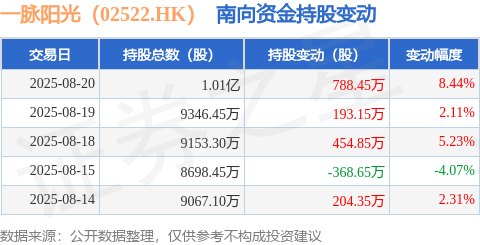 证券之星消息,8月20日南向资金增持788.45万股一脉阳光(02522.HK)。近5个交易日中,获南向资金增持的有4天,累计净增持1272.15万股。近20个交易日中,获南向资金增持的有15天,累计净增持2712.75万股。截至目前,南向资金持有一脉阳光(02522.HK)1.01亿股,占公司已发行普通股的39.1%。