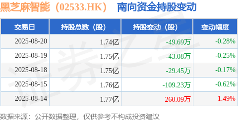 证券之星消息,8月20日南向资金减持49.69万股黑芝麻智能(02533.HK)。近5个交易日中,获南向资金增持的有1天,累计净增持28.64万股。近20个交易日中,获南向资金增持的有14天,累计净增持1042.07万股。截至目前,南向资金持有黑芝麻智能(02533.HK)1.74亿股,占公司已发行普通股的27.49%。