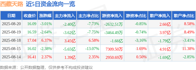 证券之星消息,截至2025年8月20日收盘,西藏天路(600326)报收于16.09元,下跌3.01%,换手率14.49%,成交量192.4万手,成交额31.0亿元。