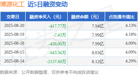 证券之星消息,8月20日,博源化工(000683)融资买入2383.15万元,融资偿还2800.93万元,融资净卖出417.77万元,融资余额7.94亿元。
