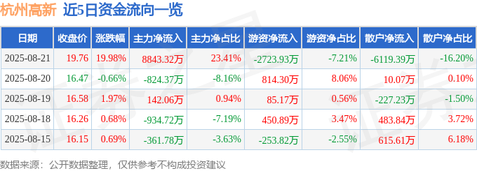 8月21日的资金流向数据方面,主力资金净流入8843.32万元,占总成交额23.41%,游资资金净流出2723.93万元,占总成交额7.21%,散户资金净流出6119.39万元,占总成交额16.2%。
