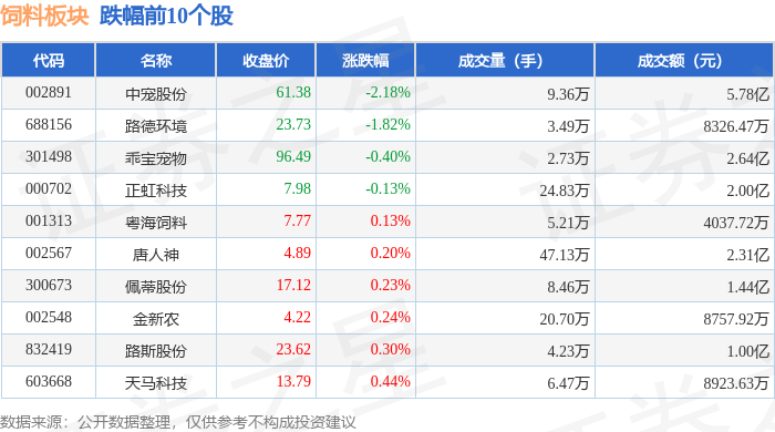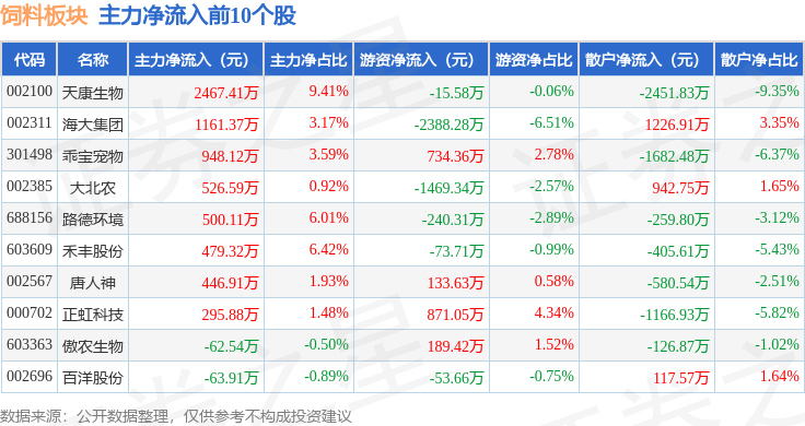 从资金流向上来看,当日饲料板块主力资金净流出2210.4万元,游资资金净流出621.58万元,散户资金净流入2831.98万元。饲料板块个股资金流向见下表: