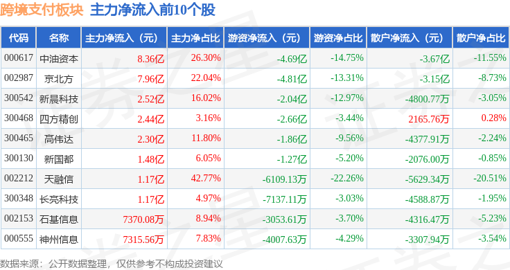 从资金流向上来看,当日跨境支付板块主力资金净流入14.58亿元,游资资金净流出18.87亿元,散户资金净流入4.29亿元。跨境支付板块个股资金流向见下表: