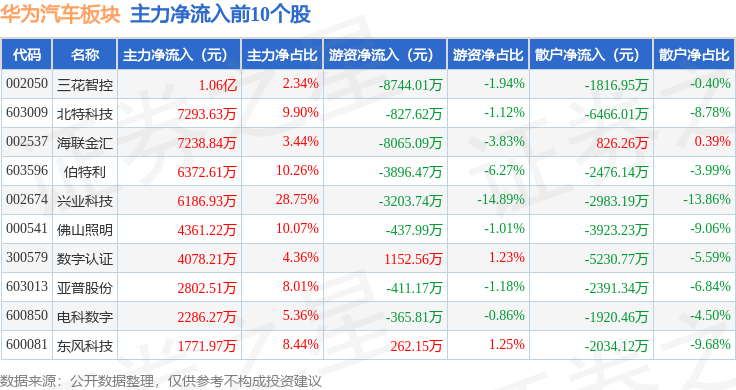 从资金流向上来看,当日华为汽车板块主力资金净流出45.98亿元,游资资金净流入12.39亿元,散户资金净流入33.59亿元。华为汽车板块个股资金流向见下表: