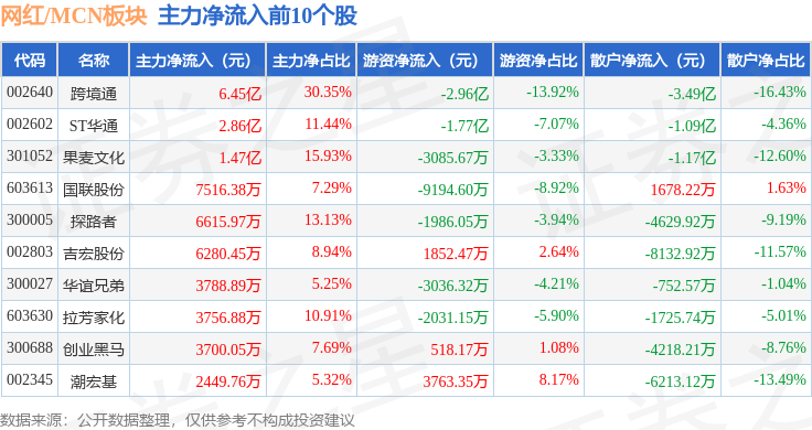 从资金流向上来看,当日网红/MCN板块主力资金净流出11.3亿元,游资资金净流出4.98亿元,散户资金净流入16.29亿元。网红/MCN板块个股资金流向见下表: