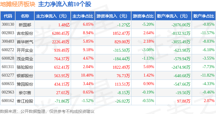 从资金流向上来看,当日地摊经济板块主力资金净流出4.04亿元,游资资金净流出1.23亿元,散户资金净流入5.27亿元。地摊经济板块个股资金流向见下表: