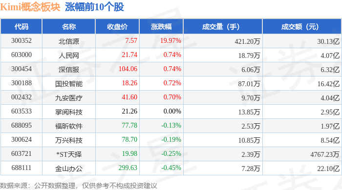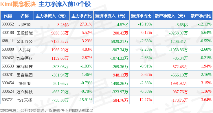 从资金流向上来看,当日Kimi概念板块主力资金净流入5.19亿元,游资资金净流出4.06亿元,散户资金净流出1.13亿元。Kimi概念板块个股资金流向见下表: