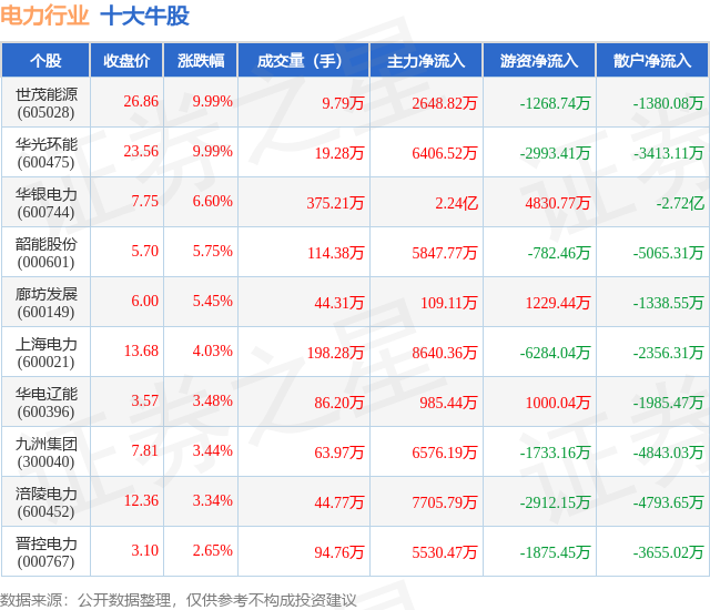 个股表现方面,电力行业当日领涨股为世茂能源(605028),该股当日报收26.86,上涨9.99%,成交量9.79万,主力资金净流入2648.82万元。华光环能(600475)以上涨9.99%紧随其后,该股当日成交量19.28万,主力资金净流入6406.52万元。除此之外,华银电力(600744)、韶能股份(000601)、廊坊发展(600149)均进入当日牛股之列。具体个股列表见下表: