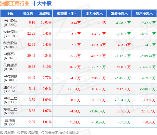 个股表现方面,油服工程行业当日领涨股为准油股份(002207),该股当日报收8.1,上涨10.05%,成交量53.44万,主力资金净流入1.19亿元。潜能恒信(300191)以上涨6.41%紧随其后,该股当日成交量23.99万,主力资金净流入3541.26万元。除此之外,科力股份(920088)、中曼石油(603619)、贝肯能源(002828)均进入当日牛股之列。具体个股列表见下表: