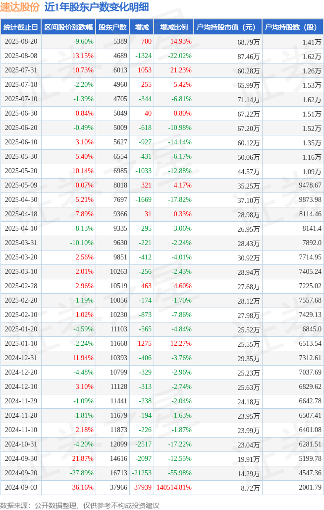从股价来看,2025年8月8日至2025年8月20日,速达股份区间跌幅为9.6%,在此期间股东户数增加700.0户,增幅为14.93%。