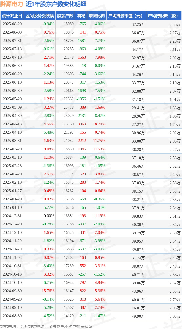 从股价来看,2025年8月8日至2025年8月20日,黔源电力区间跌幅为0.94%,在此期间股东户数减少765.0户,减幅为4.06%。