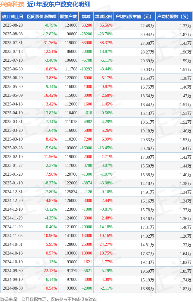 从股价来看,2025年8月8日至2025年8月20日,兴森科技区间跌幅为0.79%,在此期间股东户数增加3.32万户,增幅为36.56%。