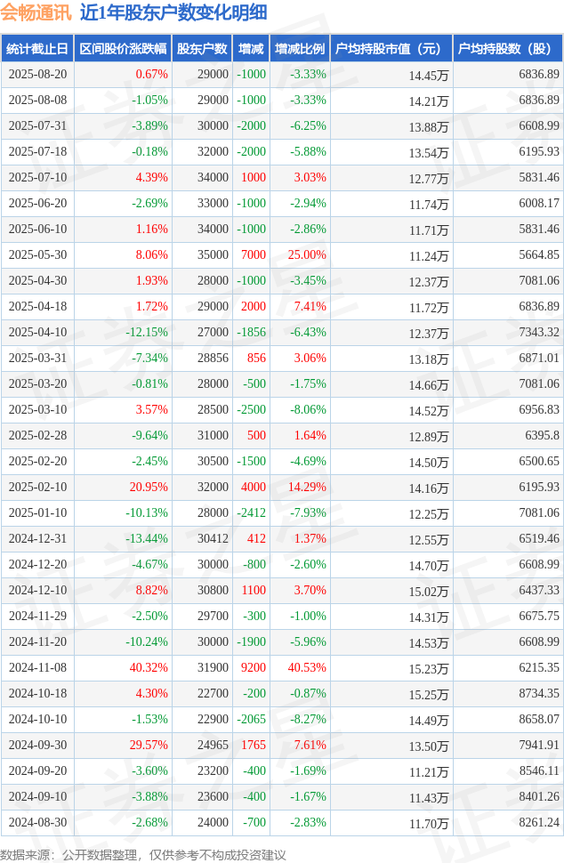 从股价来看,2025年7月31日至2025年8月20日,会畅通讯区间涨幅为0.67%,在此期间股东户数减少1000.0户,减幅为3.33%。