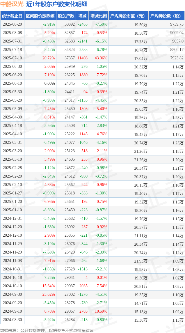 从股价来看,2025年8月8日至2025年8月20日,中船汉光区间跌幅为2.91%,在此期间股东户数减少2465.0户,减幅为7.5%。