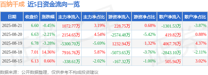 证券之星消息,截至2025年8月21日收盘,百纳千成(300291)报收于6.6元,下跌0.45%,换手率5.48%,成交量50.89万手,成交额3.36亿元。
