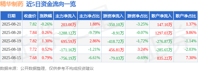 证券之星消息,截至2025年8月21日收盘,精华制药(002349)报收于7.82元,下跌0.26%,换手率1.69%,成交量13.79万手,成交额1.08亿元。
