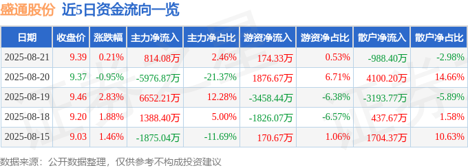 证券之星消息,截至2025年8月21日收盘,盛通股份(002599)报收于9.39元,上涨0.21%,换手率8.84%,成交量35.19万手,成交额3.31亿元。