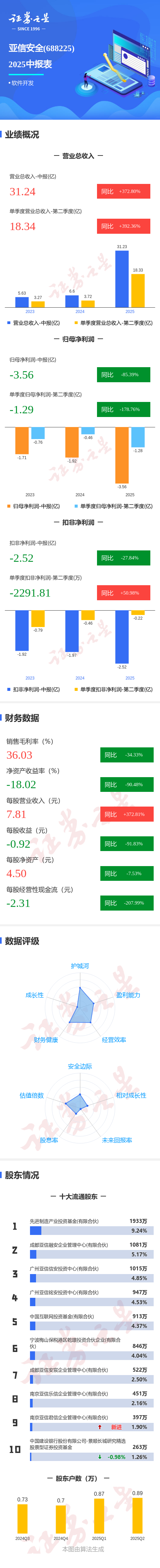 证券之星消息,亚信安全2025年中报显示,公司主营收入31.24亿元,同比上升372.81%;归母净利润-3.56亿元,同比下降85.39%;扣非净利润-2.52亿元,同比下降27.85%;其中2025年第二季度,公司单季度主营收入18.34亿元,同比上升392.37%;单季度归母净利润-1.29亿元,同比下降178.77%;单季度扣非净利润-2291.81万元,同比上升50.98%;负债率49.88%,投资收益760.35万元,财务费用3828.89万元,毛利率36.03%。