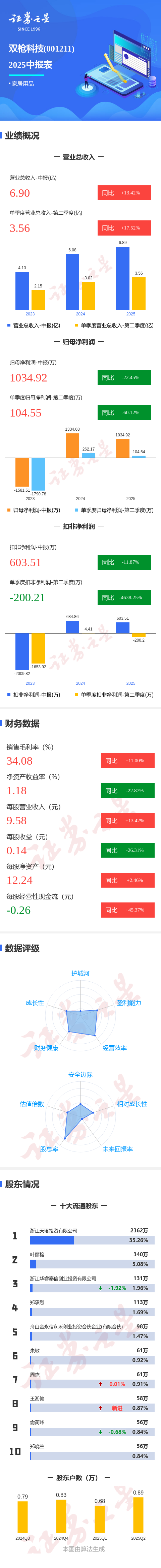证券之星消息,双枪科技2025年中报显示,公司主营收入6.9亿元,同比上升13.43%;归母净利润1034.92万元,同比下降22.46%;扣非净利润603.51万元,同比下降11.88%;其中2025年第二季度,公司单季度主营收入3.56亿元,同比上升17.53%;单季度归母净利润104.55万元,同比下降60.12%;单季度扣非净利润-200.21万元,同比下降4638.26%;负债率52.86%,投资收益9.67万元,财务费用990.95万元,毛利率34.08%。