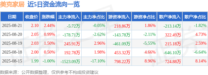 证券之星消息,截至2025年8月21日收盘,美克家居(600337)报收于2.1元,上涨2.44%,换手率3.9%,成交量56.03万手,成交额1.17亿元。