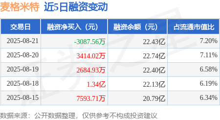 证券之星消息,8月21日,麦格米特(002851)融资买入2.94亿元,融资偿还3.25亿元,融资净卖出3087.56万元,融资余额22.43亿元,近20个交易日中有11个交易日出现融资净买入。