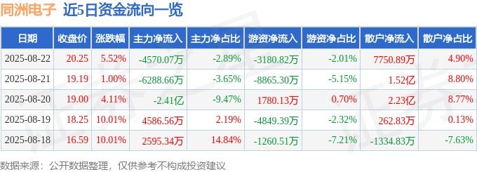 证券之星消息,截至2025年8月22日收盘,同洲电子(002052)报收于20.25元,上涨5.52%,换手率11.83%,成交量81.56万手,成交额15.81亿元。